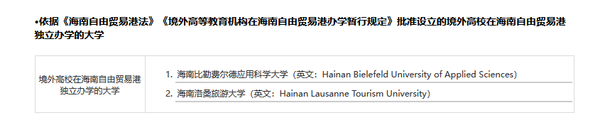 此外,教育部中外合作办学监管工作信息平台显示,海南洛桑旅游大学是继海南比勒费尔德应用科学大学后,全国第2所境外高校在海南自由贸易港独立办学的大学。